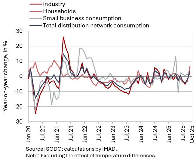 Electricity consumption in the distribution network was 3.6% higher year-on-year in October. With the same number of working days, industrial consumption, which can serve as an indicator of economic activity, was 1.7% lower month-on-month, while it was 2.5% higher year-on-year. Household consumption and small business consumption were higher year-on-year (by 6.5 and 1.8% respectively).