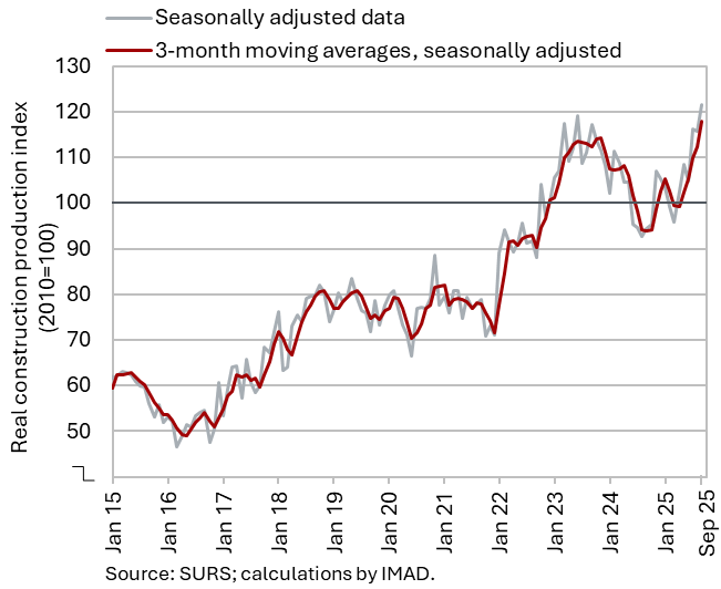 In September, the value of construction works continued to strengthen markedly. Following a decline in the first quarter, construction activity strengthened over the remainder of the year: in the second quarter by 6%, and in the third by as much as 12% (all seasonally adjusted). In the first nine months of the year, the total value of construction put in place was 7% higher than in the same period last year. The largest increase was recorded in the construction of non-residential buildings and specialised construction activities (12%). Activity was also higher in civil engineering (2%), while it was lower in the construction of residential buildings (–2%).