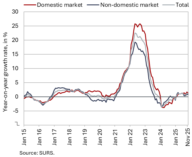In November, the year-on-year growth in Slovenian industrial producer prices declined by 0.2 p.p., to 1.1%, amid a 0.3% month-on-month increase. The lower growth rate was primarily driven by a higher base effect in energy products, which had risen by more than one tenth in November last year. Energy prices were thus 7.3% lower year-on-year, and prices in the capital goods group were also slightly lower (by 0.1%). Prices of consumer goods continue to record the fastest growth (4.1%). This is driven mainly by the increase in prices of non-durable consumer goods (4.7%), where high year-on-year price growth in the manufacture of food products (5.5%) and beverages (5.6%) persists. Growth in raw material prices was 0.9% in November. Slovenian industrial producer prices were 1.3% higher year-on-year on the domestic market and 0.9% higher on foreign markets.