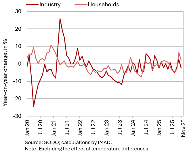 The November data indicate a year-on-year decrease in electricity consumption in industry. With the same number of working days, consumption in November was 2.4% lower than in the same month last year. By contrast, household electricity consumption increased by 2.2% year-on-year.