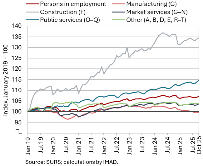 The number of persons in employment remained similar in October to previous months (seasonally adjusted) and was 0.4% lower year-on-year. The number of employees was lower year-on-year (–0.6%), while the number of self-employed increased (1.4%). The sharpest year-on-year decline in the number of persons in employment was recorded in administrative and support service activities (–3.6%), mainly due to a decrease in employment agencies, followed by manufacturing (–2.3%), and information and communication (–1.2%). The number of persons in employment continued to increase on a year-on-year basis in public service activities, particularly in human health and social work activities (up 3.4%). The number of foreign citizens in employment increased by 1.5% year-on-year in October, while the number of Slovenian nationals in employment declined by 0.7%.