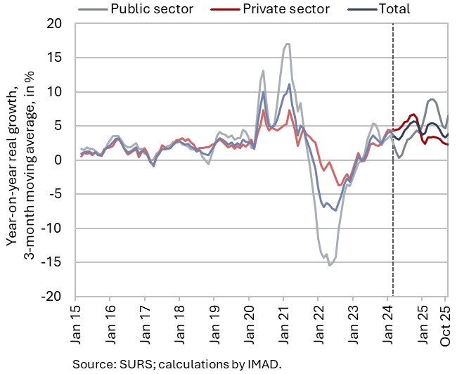 In the first ten months, the overall average gross wage increased by 4.6% in real terms (by 7% in nominal terms) – by 7.4% in the public sector and by 2.9% in the private sector (by 9.8% and 5.3% in nominal terms respectively).