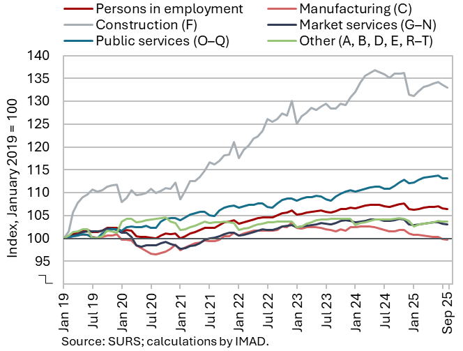 The number of persons in employment remained similar in September to previous months (seasonally adjusted) and was 0.4% lower year-on-year. The number of employees was lower year-on-year (–0.6%), while the number of self-employed increased (1.5%). The sharpest year-on-year decline in the number of persons in employment was recorded in administrative and support service activities (–4.3%), mainly due to a decrease in employment agencies, followed by manufacturing (–1.7%), and construction (–1.6%). Year-on-year growth in the number of persons in employment continued in public service activities, namely in human health and social work activities (up 3.5%) and in public administration (up 1.5%). The number of foreign citizens in employment increased by 1.7% year-on-year in September, while the number of Slovenian nationals in employment declined by 0.7%. According to the Statistical Register of Employment (SRDAP), the number of persons in employment fell by 0.4% year-on-year in the first nine months.