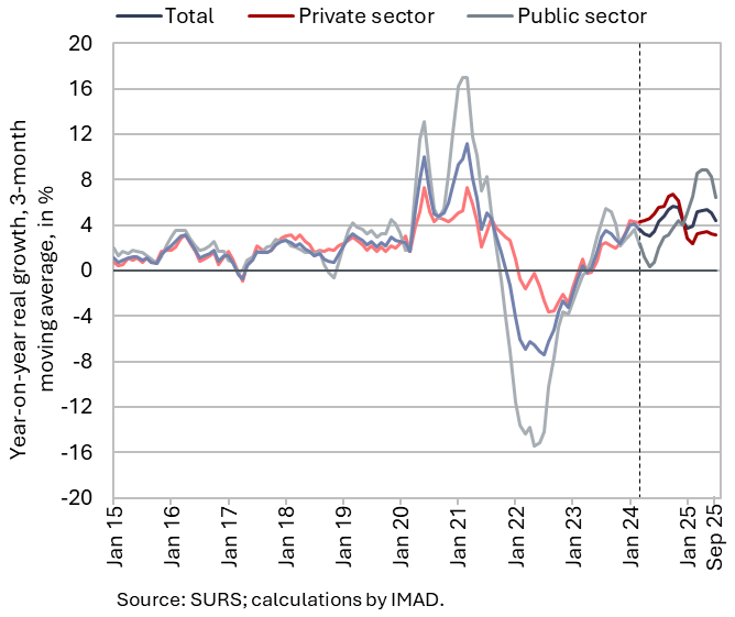 In the first nine months, the overall average gross wage increased by 4.5% in real terms (by 6.9% in nominal terms) – by 7.1% in the public sector and by 2.9% in the private sector (by 9.6% and 5.3% in nominal terms respectively).
