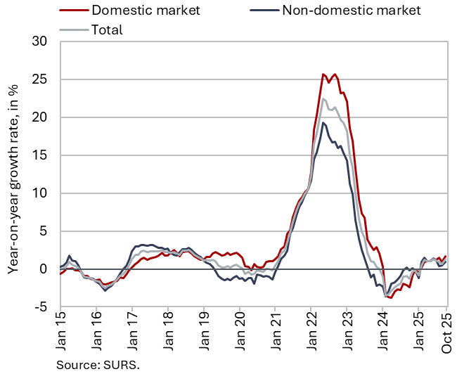 Slovenian industrial producer prices edged up slightly on a monthly basis in October (0.1%), while year-on-year growth almost doubled due to the lower base. Year-on-year price growth on the domestic market (1.7%) was higher than price growth on foreign markets (0.9%). This was mainly the result of modest (0.6%) price growth on euro area markets, while price growth on non-euro area markets is comparable to that on the domestic market. Among main industrial groups, consumer goods continued to record the highest year-on-year growth (3.8%), largely driven by rising prices of non-durable consumer goods (4.4%), within which price growth strengthened in the manufacture of food products (5.5%) and beverages (5.8%). Price growth in the intermediate goods category remained moderate (0.5%), while prices of energy and capital goods were lower year-on-year (by 0.5% and 0.1% respectively).