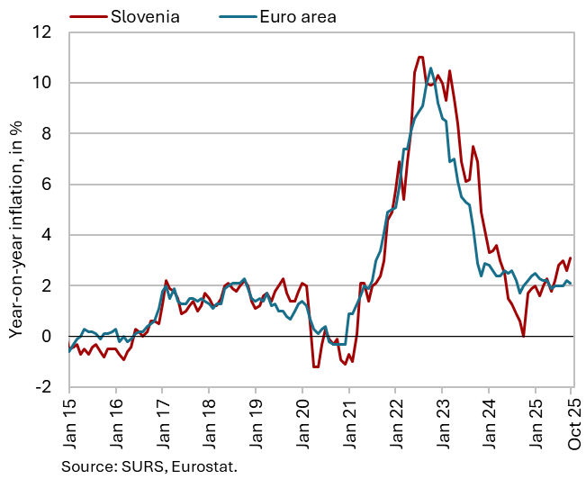 Year-on-year growth in consumer prices increased by 0.5 p.p. to 3.1% in October, with prices remaining unchanged at the monthly level. The higher annual rate was largely attributable to a lower base effect, as a new electricity network charge calculation system was introduced in October last year, starting with the lower summer tariff period. Consequently, price growth in the housing, water, electricity, gas, and other fuels group accelerated from 0.4% to 4.2% in October this year. An additional contributing factor was a 6.3% monthly increase in the price of heat energy. Year-on-year inflation continued to be driven mainly by prices in the food and non-alcoholic beverages group, which increased by 6.8% year-on-year (7.0% in September). The year-on-year growth in prices of durable goods strengthened slightly in October but remained moderate at 0.6%. Due to less pronounced seasonal price increases in the clothing and footwear group, the year-on-year growth in semi-durable goods prices slowed further, reaching 0.2% – the lowest level since September last year. The year-on-year growth in service prices (2.7%) fell below 3% in the last two months.