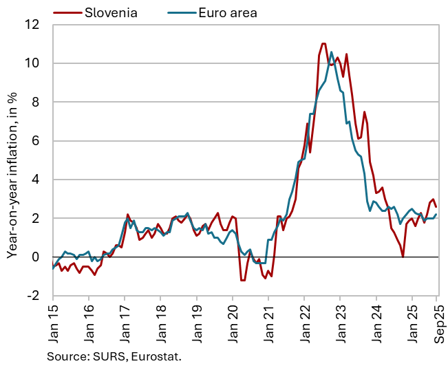 Year-on-year growth in consumer prices eased slightly in September, to 2.6%. Following a modest decline in clothing and footwear prices in August, prices in this group rose again in September (by 8.5%), though their year-on-year growth rate more than halved (to 3%). This contributed to a lower year-on-year increase in semi-durable goods prices (2% compared with 5.2% in August). Price growth in durable goods remained moderate (0.4%). Year-on-year growth in food and non-alcoholic beverage prices also slowed somewhat in September, yet remained the highest among all goods and services groups, at 7%, contributing 1.3 p.p. to the overall 2.6% year-on-year inflation rate. Year-on-year growth in service prices stood at 2.8% and has fluctuated around 3% since the beginning of the year. Year-on-year inflation, measured by the HICP, stood at 2.7% in September, 0.5 p.p. higher than in the euro area. Preliminary data indicate that much of this difference continues to stem from significantly higher growth in food, alcohol, and tobacco prices (Slovenia 6.2%, euro area 3%).