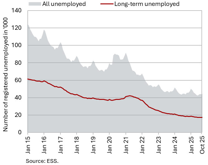 The number of registered unemployed persons continued to increase slightly in October (by 0.2%, seasonally adjusted). According to original data, 45,670 people were unemployed at the end of October, 3.9% more than at the end of September. This largely reflects seasonal trends related to a higher inflow of first-time job seekers into unemployment upon completion of the academic year. Year-on-year, the number of unemployed was 0.5% higher, which is largely due to the increased inflow of first-time jobseekers into unemployment since July this year as a result of a higher inflow of foreign nationals with temporary protection status into the unemployment register, and partly also to cyclical developments. The year-on-year declines in long-term unemployment (–6.7%) and in unemployment among persons aged 50 and over (–7.6%) were similar to previous months. Since the end of last year, the number of unemployed young people (aged 15–29) has been above the level recorded a year earlier (in October, it was up 8.3% year-on-year).