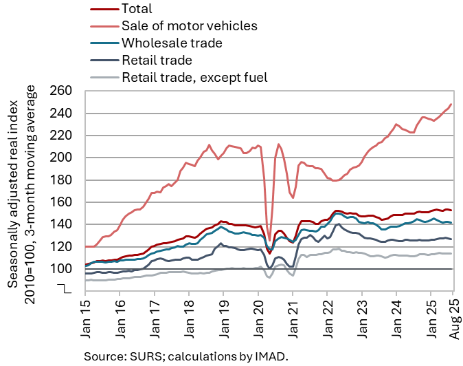 Turnover in trade was, on average, lower in July and August than in the second quarter (seasonally adjusted), except in motor vehicle sales. Turnover in wholesale trade, which had already declined in the second quarter, continued to fall in July and August and was lower year-on-year for the second consecutive period. Turnover in retail trade with food products also fell year-on-year, having decreased on average in July and August after weak growth in the second quarter. Turnover in retail trade with non-food products was, after growth in the first two quarters, slightly lower on average in July and August, but remained higher year-on-year. In the motor vehicles sales, turnover growth persisted through the summer months. Across all trade sectors, sales were higher year-on-year in the first eight months of the year. Growth in motor vehicles sales was robust (7%), while it was modest in other trade sectors (on average below 1%).