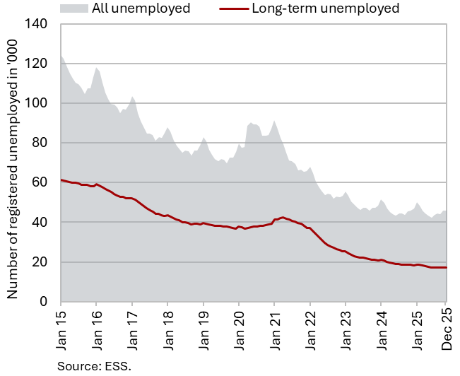In December 2025, the number of unemployed persons (seasonally adjusted) remained broadly unchanged on a month-on-month basis (–0.1%). According to original data, 47,177 people were unemployed at the end of December, representing a 3% increase compared with the end of November. This increase largely reflects seasonal factors, notably a higher inflow into unemployment following the expiry of fixed-term employment contracts. On a year-on-year basis, unemployment increased slightly (by 0.3%). The year-on-year declines in long-term unemployment (–5.6%) and in unemployment among persons aged 50 and over (–5.3%) were somewhat smaller than in previous months. The number of unemployed young persons (15–29 years) has been higher year-on-year since the end of 2024 (in December, there were 10,944 unemployed young people, representing a 9.4% year-on-year increase).