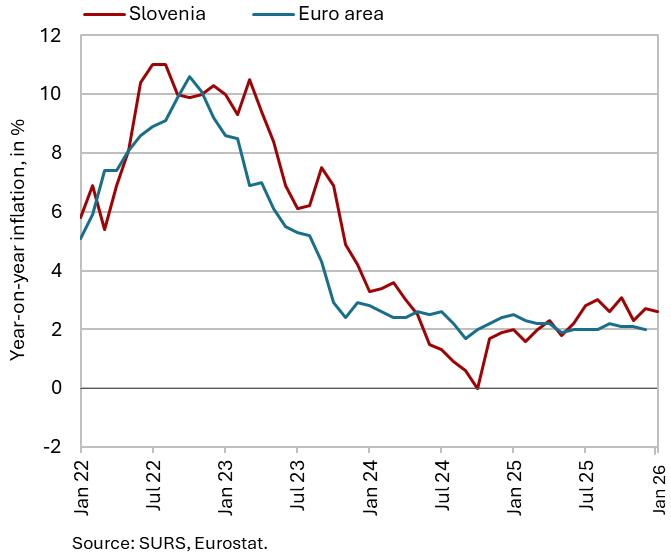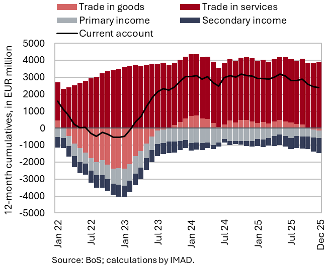 Consumer prices were 2.6% higher in January than a year earlier. The largest contribution to inflation again came from food and non-alcoholic beverages, although price growth in this category continues to moderate gradually. Electricity consumption in the distribution network in January significantly exceeded the level recorded a year earlier, while industrial consumption was 1.2% higher despite one fewer working day. After modest growth in the third quarter, manufacturing output declined in the fourth quarter of last year (seasonally adjusted). In 2025, it contracted by 1.5%, with the largest negative contributions stemming from the metal industry and the manufacture of motor vehicles, trailers, semi-trailers and other transport equipment. Construction activity also edged down at the end of the year (seasonally adjusted), although it remained higher year-on-year. Over 2025 as a whole, it was 10% above its 2024 level. However, certain other data (e.g. VAT data) do not corroborate such robust growth in construction activity. The current account surplus, which had been relatively high in 2023–2024, narrowed last year, primarily reflecting deficits in secondary income and trade in goods.