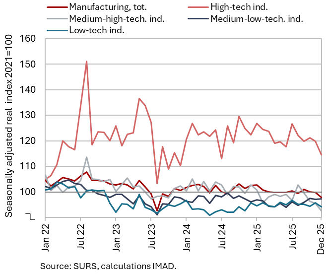 After a modest recovery in the third quarter, manufacturing output declined again in the fourth quarter of 2025 (seasonally adjusted) and was also significantly lower year-on-year (by 2.9%, working-day adjusted). Output declined in most groups classified by technological intensity, with growth maintained only in the medium-low-technology industries (seasonally adjusted), which returned to year-earlier levels by the end of the year. Nevertheless, for 2025 as a whole, output in this group was 1.8% lower than in 2024, primarily due to a pronounced contraction in the manufacture of fabricated metal products. Output in most medium-high- and high-technology industries also lagged behind 2024 levels. The manufacture of motor vehicles recorded the largest decline (by one-tenth) (together with the metal industry, it made the most substantial contribution to the overall 1.5% decrease in manufacturing output in 2025). Among the more technology-intensive industries, only the manufacture of ICT equipment recorded an increase, while the energy-intensive chemicals industry remained broadly at its 2024 level. Output in low-technology industries increased last year (by 2.0%), although this was driven solely by the food and wood-processing industries and other manufacturing.