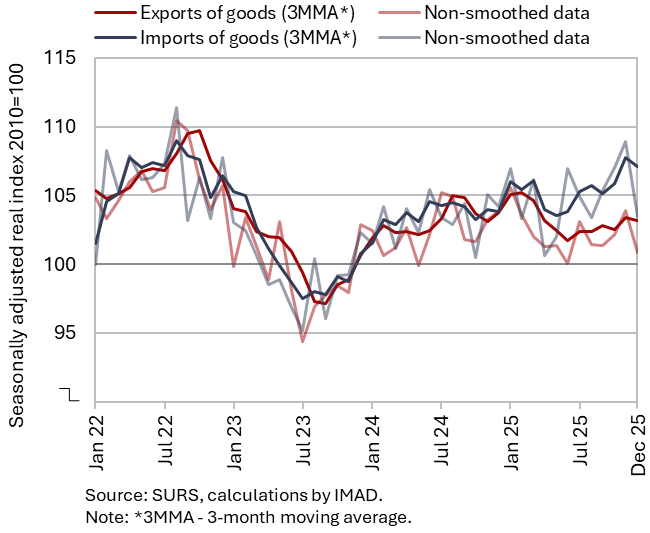 In the fourth quarter of 2025, real exports and imports of goods increased both quarter-on-quarter (seasonally adjusted) and year-on-year. Exports of goods rose for the second consecutive quarter (0.3%, seasonally adjusted); however, the pace of growth slowed, mainly due to a pronounced month-on-month decline in December. In the fourth quarter of 2025, exports increased to several of Slovenia’s main EU trading partners, notably Croatia and Austria, and were also higher to the United States and Russia. By contrast, exports declined to Germany and Italy and, among non-EU countries, particularly to Switzerland. Exports increased across most product groups, except for road vehicles and other machinery and equipment. On the import side, total imports increased by 1.8% quarter-on-quarter in the fourth quarter, driven by higher imports of intermediate and consumer goods, while imports of capital goods declined. On a year-on-year basis, both exports and imports were higher in the fourth quarter (by 0.5% and 4.2%, respectively). Over the whole of 2025, exports remained unchanged year-on-year, while imports were 2% higher.