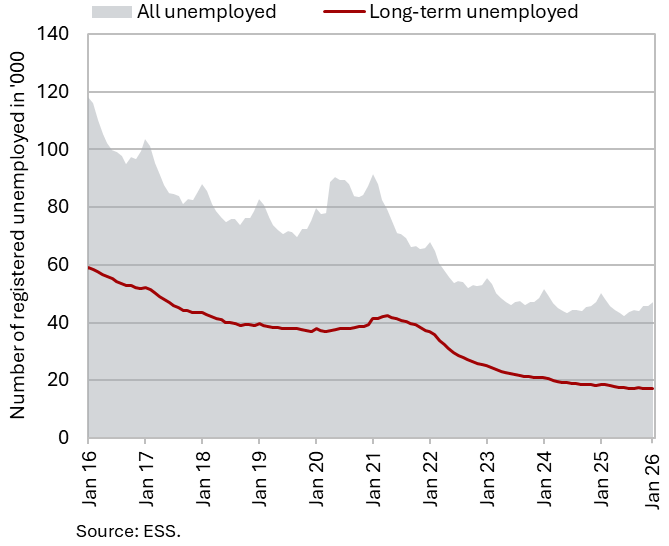 The decline in the number of unemployed persons was more pronounced in January than at the end of 2025 (seasonally adjusted). The number of unemployed, which had already fallen slightly in November and December 2025, declined by a further 0.6% in January (seasonally adjusted). According to original data, 49,778 people were unemployed at the end of January, 5.5% more than at the end of December. This rise largely reflects seasonal factors, in particular a higher inflow into unemployment due to the expiry of fixed-term employment contracts. On a year-on-year basis, unemployment was still down by 0.7%. The year-on-year declines in long-term unemployment (–6.1%) and in unemployment among persons aged 50 and over (–4.9%) were somewhat smaller than in previous months. The number of unemployed young people (aged 15–29), which has recorded year-on-year increases since October 2024, exceeded its level from a year earlier by 6.4% in January, reaching 11,108 persons.