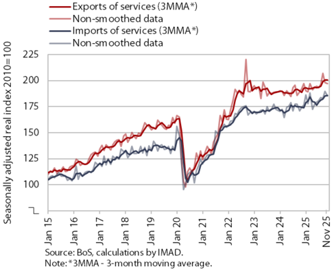 In the first eleven months of 2025, exports and imports of services were higher than in the same period of 2024 (by 3.2% and 5.2%, respectively), which also applies to most main service categories, except transport and construction services. The year-on-year increase in exports was driven primarily by exports to Italy (insurance services up by EUR 323 million year-on-year), with a notable contribution also from Switzerland (other business and ICT services) and France (transport services).