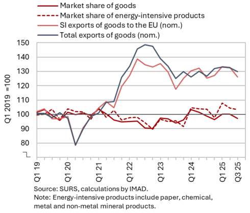 Slovenia’s export market share in the EU market declined year-on-year in the third quarter of 2025. The year-on-year growth in the nominal euro value of Slovenian goods exports lagged behind the growth of EU goods imports in all of the first three quarters of 2025. As a result, Slovenia’s export market share in the EU market was 1.8% lower year-on-year in the third quarter, and 2.1% lower cumulatively over the first three quarters. The year-on-year decline was driven by most main manufacturing product groups (road vehicles, electrical machinery and equipment, industrial machinery, and pharmaceutical products), while the market share of energy-intensive products remained similar to that a year earlier. Among Slovenia’s main trading partners, the market share in the first three quarters of 2025 was lower than a year earlier in Germany, Italy, France and Croatia, while it was higher only in Austria. The year-on-year decline was driven primarily by lower competitiveness in the EU market (e.g. cost pressures; see also Figure 4, the decline in passenger car exports following the discontinuation of a vehicle model at Slovenia’s largest car manufacturer), as Slovenia’s export structure to the EU remained broadly aligned with the structure of EU demand.