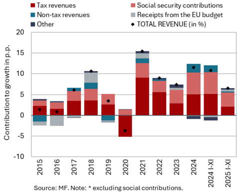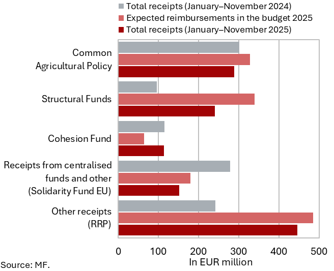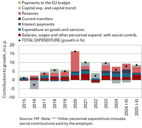 The deficit of the consolidated general government balance amounted to EUR 1.1 billion in the first eleven months of 2025, which is EUR 560 million more than in the same period a year earlier, with the increase being planned. Over the same period, general government revenues increased by 6.5%, significantly less than in the same period a year earlier (10.8%). This slowdown reflects cyclical factors and measures that temporarily boosted social-security contributions and certain tax revenues in 2024. Expenditure in the first eleven months of 2025 was 8.6% higher year-on-year, representing slightly higher growth than in the same period a year earlier (7.8%). The main drivers of expenditure growth in 2025 were employee compensation related to the implementation of the wage reform, pensions, and certain other transfers. After declining in 2024, capital expenditure also increased in 2025, particularly for the purchase of military equipment. The bulk of the consolidated general government deficit stemmed from the central government budget deficit. In the first eleven months of 2025, it amounted to EUR 976 million. As expected, it increased substantially in December and reached EUR 1,717 million in 2025 as a whole, or 2.4% of GDP, which is nevertheless slightly less than envisaged in the amended state budget for 2025 (EUR 1,866 million or 2.6% of GDP). The increase in the deficit at the end of the year was mainly driven by the payment of the winter allowance to public sector employees and pensioners, funds to cover the financial liabilities of public healthcare institutions, and an increase in investment expenditure.
