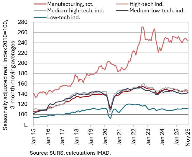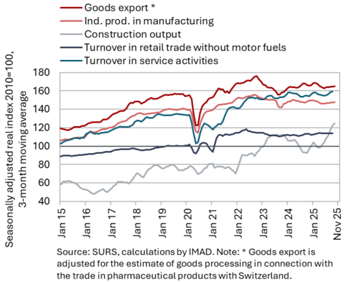 Slovenian goods exports in the first eleven months of 2025 were slightly lower than a year earlier, while activity in construction and household consumption increased over the first ten months. Real goods exports increased month-on-month in November for the second consecutive month, while imports declined. In the first eleven months of 2025, goods exports were 0.2% lower than in the same period of 2024, while imports were 1.6% higher. The decline in exports was mainly driven by lower exports of vehicles and other machinery and equipment, as well as iron and steel and some other materials (rubber products, mineral products, paper). Manufacturing output increased slightly month-on-month in November. Over the first eleven months, it remained lower year-on-year; among major activities, the year-on-year decline was largest in the manufacture of motor vehicles, trailers, semi-trailers and other transport equipment and in the metal industry. Following a decline in the first quarter of 2025, growth in the value of construction put in place strengthened markedly from the second quarter onwards; over the first ten months it was one tenth higher year-on-year. Real turnover in most trade segments increased in October following a decline in the third quarter; over first ten months of 2025, sales in all trade segments increased year-on-year. Real turnover in market services declined sharply in October after strong growth in the third quarter; in the first ten months of 2025, it was lower year-on-year only in administrative and support service activities.