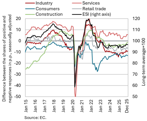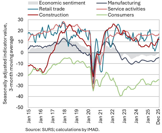 Euro area economic sentiment indicators for the fourth quarter of 2025 point to a continued expansion of economic activity. In the fourth quarter of 2025, the average value of the composite Purchasing Managers’ Index (PMI) for the euro area reached its highest level (52.3) since the second quarter of 2023. The services PMI strengthened further, rising above its long-term average, while the manufacturing PMI signalled a moderation in activity growth. The Economic Sentiment Indicator (ESI) for the euro area also increased to its highest level since the second quarter of 2023, with confidence improving quarter-on-quarter across all sectors and among consumers. Economic sentiment was also more favourable than in the fourth quarter of 2024, with confidence rising markedly in both industry and construction. Nevertheless, overall sentiment has remained below its long-term average since June 2022. In Germany, Slovenian largest trading partner, confidence indicators present a mixed picture. The Ifo Business Climate Index deteriorated slightly further in December, reflecting more pessimistic expectations regarding business conditions in manufacturing. By contrast, the ZEW indicator increased in December, supported by a pronounced improvement in expectations within the automotive industry.