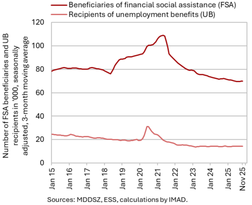 The number of unemployment benefit (UB) recipients and the number of financial social assistance (FSA) beneficiaries declined again year-on-year in November. There were 13,493 UB recipients, representing a decrease of 3.7% compared with November 2024. In November, their share among all unemployed persons (29.5%) was slightly below the level recorded a year earlier (30.6%). With the continued decline in the number of long-term unemployed persons, who are often eligible for FSA, the number of FSA beneficiaries also fell year-on-year. In November, 68,493 persons were eligible for FSA, 2.5% fewer than a year earlier, representing a lower decline than in recent months. On average, around EUR 20 million per month was disbursed for FSA last year.