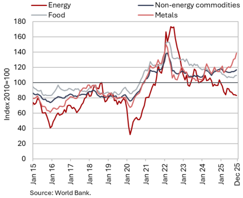 The average Brent crude oil price declined in December compared with November, while the average price of non-energy commodities increased slightly. The average dollar price of Brent crude oil fell by a further 1.9% to USD 62.60 and the euro price by 3.2% to EUR 53.45. Year-on-year, oil prices were 15.3% lower in US dollars and 24.2% lower in euros. On average in 2025, the oil prices were 14.2% lower in US dollars and 17.4% lower in euros than a year earlier. In December, the average euro price of natural gas on the European market (Dutch TTF) declined further, amid increased inflows of liquefied natural gas from the United States and stable supply from Norway. The price fell by 10.5% to EUR 27.62/MWh, marking the lowest level in nearly two years. On a year-on-year basis, the price decreased by 38.8%. On average in 2025, it was 5.3% higher than in 2024. According to the World Bank, the average dollar price of non-energy commodities increased slightly month-on-month in December, while remaining broadly unchanged year-on-year. Month-on-month, prices of metals and minerals recorded the largest increase (5.3%) and were also significantly higher year-on-year (19.2%). In 2025, dollar prices of non-energy commodities were 2.4% higher than in 2024.