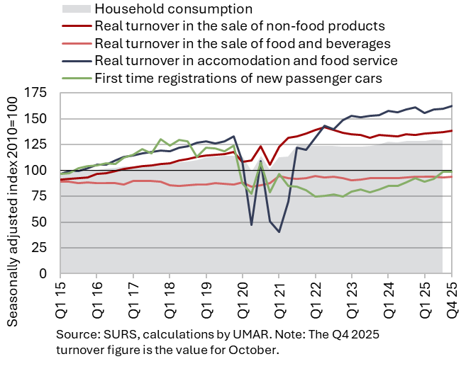 Following real growth of 1% in the third quarter, the available data also suggest that household consumption increased year-on-year in the fourth quarter of 2025. The number of sold new passenger cars used by natural persons was 6% higher year-on-year in October. Households also recorded higher year-on-year spending on food, beverages and tobacco products as well as on non-food products (total turnover in retail sale of food products and non-food products was 3% higher in real terms). The number of overnight stays by domestic tourists in Slovenia and Croatia and total spending on tourism services abroad were also higher year-on-year.
