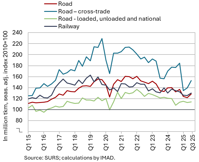The volume of road and rail freight transport, which had been declining from 2022, increased slightly in the third quarter of 2025. Overall, the volume of road transport increased by 5% on a quarterly basis (seasonally adjusted), but continued to decline year-on-year (by 3%). In road transport performed by Slovenian vehicles, the volume of cross-trade increased markedly for the second consecutive quarter (following a sharp decline in the first quarter), while the volume of transport at least partly taking place on Slovenian territory (exports, imports and national transport) increased only modestly. The share of cross-trade in total transport was 43%, which was 5 p.p. lower than before the COVID-19 pandemic. Rail freight transport on Slovenian territory increased by 3% in the third quarter (seasonally adjusted), but decreased by 4% year-on-year. In 2025, the volume of road and rail freight transport was the lowest since 2016.