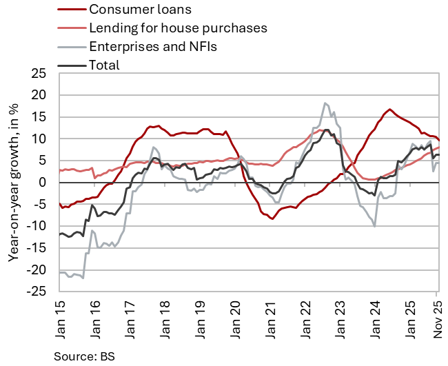 Year-on-year growth in the volume of loans to domestic non-banking sectors remained largely unchanged month-on-month (6.3%). Growth in corporate and NFI loans (4.5%) and household loans (7.6%) did not change significantly. Within household lending, housing loans grew by 8.1% and accounted for almost two-thirds of total household loans. The volume of new lending in the form of housing loans increased by half in the first eleven months of 2025 compared with the same period of 2024. The growth of consumer loans continued to moderate gradually and, at 9.6 %, was the lowest since October 2023. Year-on-year growth in non-financial sector deposits (6.3%) was maintained, driven primarily by an increase in overnight deposits (8.6%). These account for more than 80% of total non-banking sector deposits. Corporate and NFI deposits (7%) are increasing at a somewhat faster rate than household deposits (5.9%). The asset quality of the banking system remains good. In October, the share of non-performing exposures remained unchanged at 1.2%.