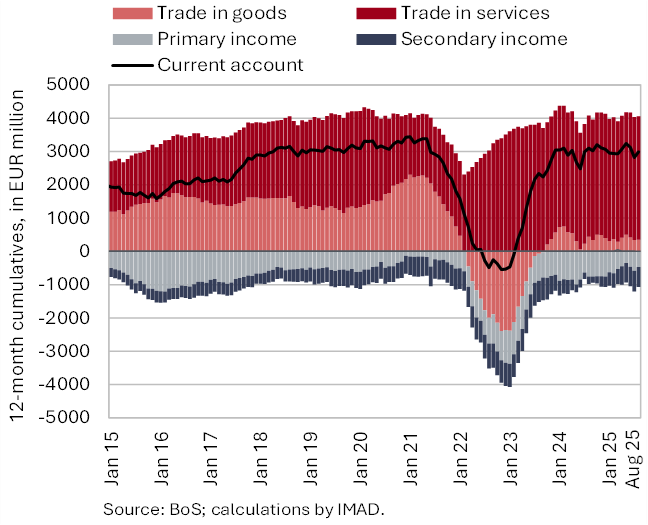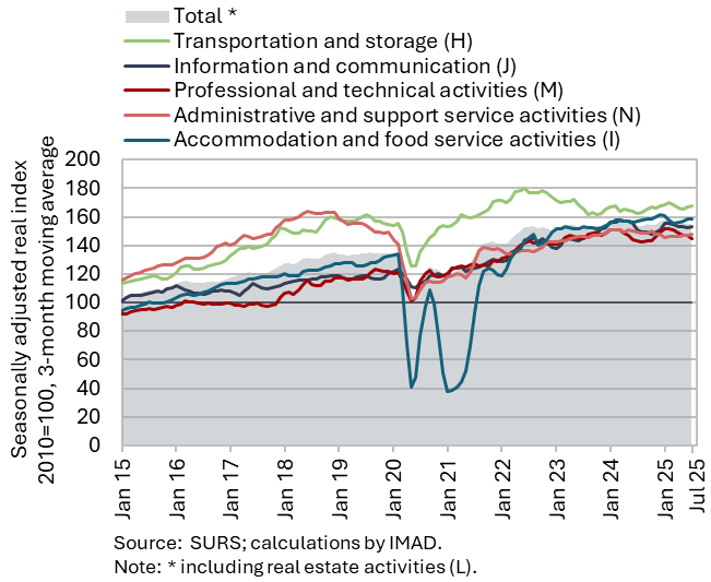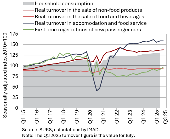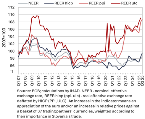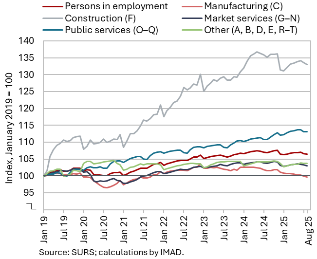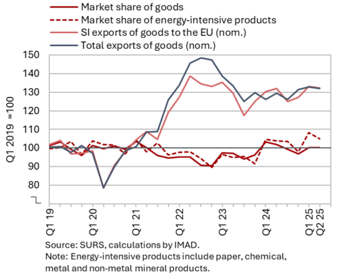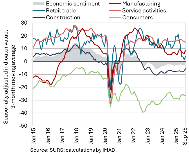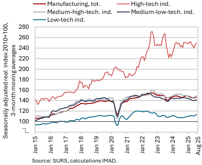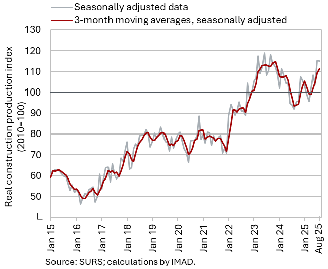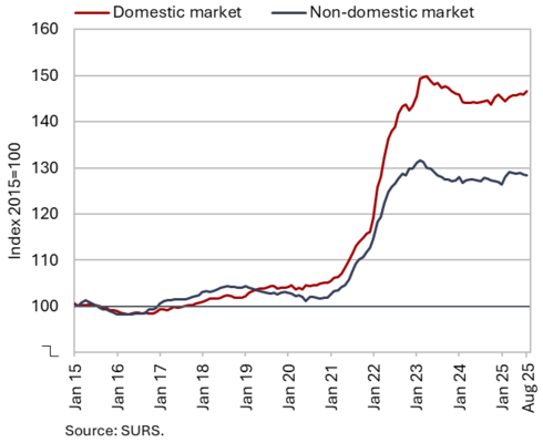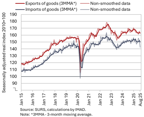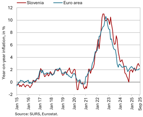 The available economic indicators for Slovenia in recent months point to several positive developments in the export sector. Manufacturing output has been strengthening across all groups of industries by technological intensity since mid-year. Nevertheless, after the first eight months, it remained slightly below the level recorded in the same period last year. Total orders in manufacturing also remained at a low level in September, while production expectations improved slightly. Goods exports and imports (excluding operations involving processing) fell on a monthly basis in August, following real growth in July. On average over the first eight months of the year, exports declined year-on-year, while imports remained broadly unchanged. After declining in the second half of 2024, Slovenia’s goods export share in the EU market has stabilised on a quarter-on-quarter basis this year, though it remained slightly lower year-on-year in the first half of 2025. Activity growth in construction strengthened in the third quarter, while growth in household consumption, according to various indicators, moderated during this period. Economic sentiment improved further in September and was also higher than in the same month last year. Following the decline at the end of last year, the number of persons in employment remained broadly unchanged up to August this year, while the number of unemployed increased for the third consecutive month in September amid a higher inflow of citizens with temporary protection status. Year-on-year inflation eased slightly in September. The largest upward contribution to inflation continued to come from higher prices of food and non-alcoholic beverages.