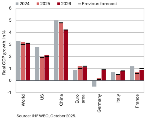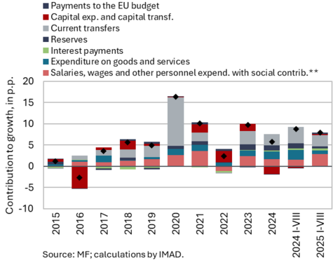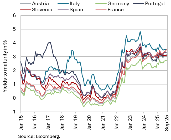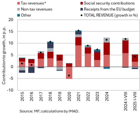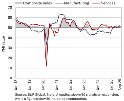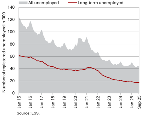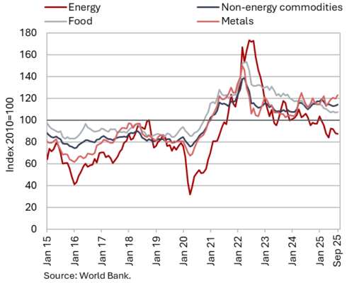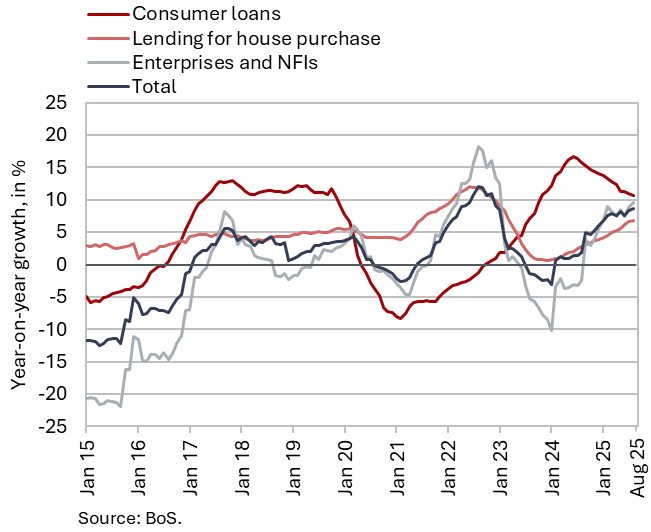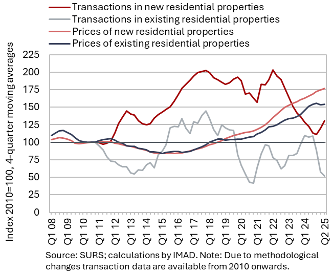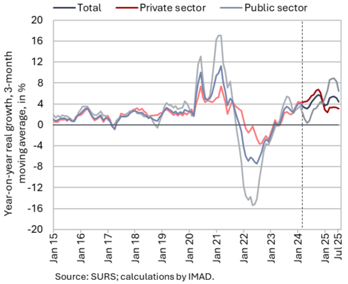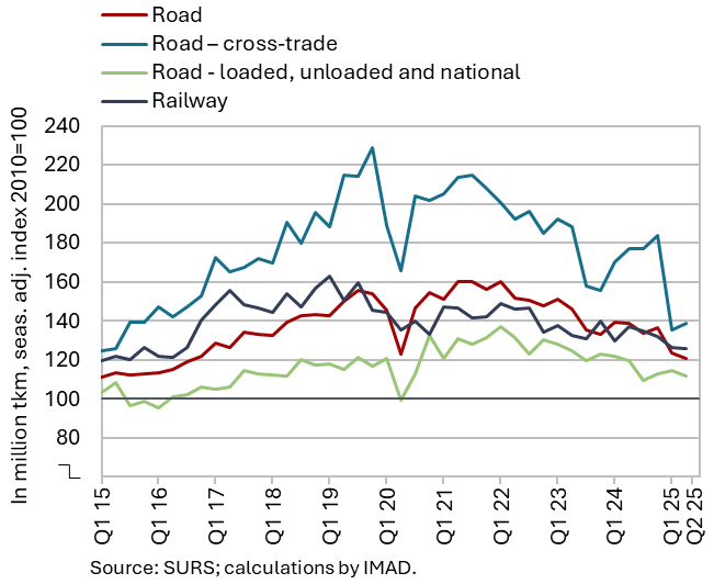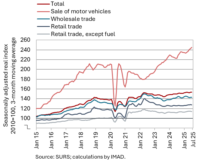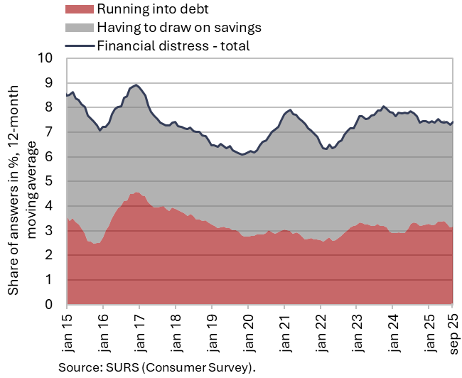 The available economic indicators for Slovenia in recent months point to several positive developments in the export sector. Manufacturing output has been strengthening across all groups of industries by technological intensity since mid-year. Nevertheless, after the first eight months, it remained slightly below the level recorded in the same period last year. Total orders in manufacturing also remained at a low level in September, while production expectations improved slightly. Goods exports and imports (excluding operations involving processing) fell on a monthly basis in August, following real growth in July. On average over the first eight months of the year, exports declined year-on-year, while imports remained broadly unchanged. After declining in the second half of 2024, Slovenia’s goods export share in the EU market has stabilised on a quarter-on-quarter basis this year, though it remained slightly lower year-on-year in the first half of 2025. Activity growth in construction strengthened in the third quarter, while growth in household consumption, according to various indicators, moderated during this period. Economic sentiment improved further in September and was also higher than in the same month last year. Following the decline at the end of last year, the number of persons in employment remained broadly unchanged up to August this year, while the number of unemployed increased for the third consecutive month in September amid a higher inflow of citizens with temporary protection status. Year-on-year inflation eased slightly in September. The largest upward contribution to inflation continued to come from higher prices of food and non-alcoholic beverages.