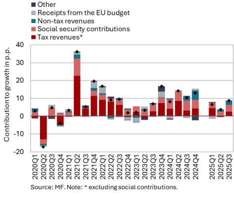 The consolidated general government deficit in the first nine months of 2025 was EUR 521.3 million higher than in the same period of 2024. It totalled EUR 954.4 million, with the increase reflecting a deceleration in revenue growth, while expenditure continued to expand at a pace similar to last year. Year-on-year revenue growth in the third quarter (8.7%) was considerably higher than in the second (3.7%), driven by an increase in tax revenues, which had declined year-on-year in the second quarter, and by a strengthening of non-tax revenue growth. In the first nine months, revenues rose by 6.2%, compared with 10.9% in the same period last year. This year’s slowdown reflects cyclical factors and last year’s measures that had boosted social-security contributions and certain tax revenues. Expenditure growth slowed slightly in the third quarter (7.4%) compared with the second (9.4%), primarily due to slower growth in wages and other remunerations, as well as a deceleration in allocations to reserves. In the first nine months of this year, expenditure rose by 8.4% year-on-year, similar to the increase recorded in the same period last year (8.6%). The main drivers of expenditure growth in 2025 are employee compensation related to the implementation of the wage reform, pensions, and certain other transfers. The bulk of the consolidated general government deficit stems from the central government budget deficit. In the first nine months of this year, the central government deficit amounted to EUR 952.5 million, while preliminary data indicate that it was somewhat lower in the first ten months (EUR 910 million). By year-end, the deficit is planned to increase. While revenue is projected to strengthen due to the disbursement of funds under the Recovery and Resilience Plan, expenditure growth is expected to intensify due to the second tranche of payments under the public sector pay reform, the payment of the winter holiday allowance, the winter supplement for pensioners and the acceleration of investment spending.