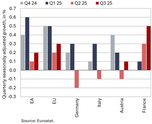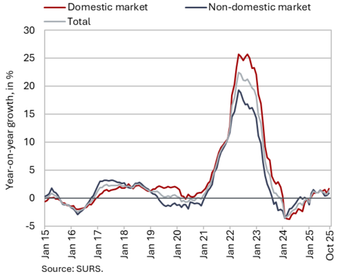 In the third quarter, euro area GDP increased by 0.2% quarter-on-quarter and by 1.4% year-on-year (both seasonally adjusted). The strongest contribution to the quarterly acceleration came from France, where year-on-year growth reached a two-year high (0.5%, 0.9% year-on-year). This was primarily driven by stronger net exports, supported by increased output in the aviation and refinery industries. Among Slovenia’s main trading partners, Austria also recorded GDP growth in the third quarter (0.1% quarter-on-quarter, 0.6% year-on-year), with quarter-on-quarter growth supported by private consumption, while investment and net exports declined. In Germany, GDP was flat in the third quarter (0.3% higher year-on-year) after a 0.2% contraction in the previous quarter, amid falling exports and higher investment in machinery and equipment. Italy’s GDP likewise stagnated in the third quarter (up 0.4% year-on-year), reflecting a positive contribution from net exports and lower domestic demand. In the first nine months, GDP in the euro area was up 1.5% year-on-year.