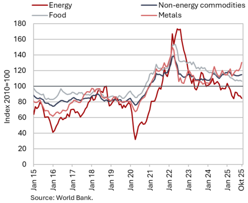 Brent crude oil prices decreased on average in October compared with September, while the average price of non-energy commodities remained unchanged. The average dollar price of Brent crude oil fell by 5.1% to USD 64.54 and the euro price by 4.2% to EUR 55.5. The relatively low price level is partly attributable to the OPEC+ decision to raise production quotas. Year-on-year, the price of oil was 14.7% lower in US dollars and 20% lower in euros. The average euro price of natural gas on the European market (Dutch TTF) fell further in October amid high storage levels in Europe, decreasing by 1.3% to EUR 31.9/MWh, reaching its lowest level in the past year and a half; on a year-on-year basis, it was 21% lower. According to the World Bank, the average dollar price of non-energy commodities remained unchanged both month-on-month and year-on-year in October. Prices of most main commodity groups declined month-on-month, while metal prices rose sharply (+5.5%). On a year-on-year basis, prices of fertilisers, metals, and beverage raw materials (notably coffee) remain substantially higher, while food prices declined.