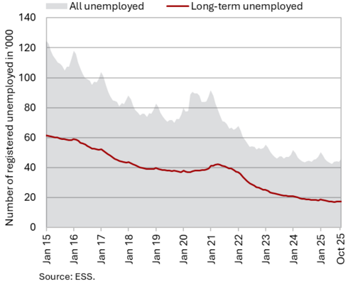 The number of registered unemployed persons continued to increase slightly in October (by 0.2%, seasonally adjusted). According to original data, 45,670 people were unemployed at the end of October, 3.9% more than at the end of September. This largely reflects seasonal trends related to a higher inflow of first-time job seekers into unemployment upon completion of the academic year. Year-on-year, the number of unemployed was 0.5% higher in October, which is largely due to the increased inflow of first-time jobseekers into unemployment since July this year as a result of a higher inflow of foreign nationals with temporary protection status into the unemployment register, and partly also to cyclical developments. The year-on-year declines in long-term unemployment (–6.7%) and in unemployment among persons aged 50 and over (–7.6%) were similar to previous months. Since the end of last year, the number of unemployed young people (aged 15–29) has been above the level recorded a year earlier (in October, it was up 8.3% year-on-year).