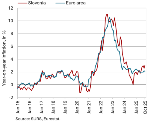 Activity in most sectors in Slovenia has strengthened on a month-on-month basis since mid-year. The strongest increase was recorded in construction activity, particularly construction investment in infrastructure and non-residential buildings. After contracting in the first half of the year, real goods exports and manufacturing output also rose in the third quarter, while turnover in market services increased on average in July and August. The economic sentiment indicator has been improving since mid-year. By October, confidence had strengthened across all sectors, albeit only modestly in manufacturing, where the confidence indicator has not yet surpassed its long-term average. The consumer confidence indicator also remained below its long-term average. The number of persons in employment remained broadly unchanged at the end of the third quarter relative to previous months, while the number of unemployed increased slightly again at the beginning of the fourth quarter. Year-on-year growth in gross wages strengthened slightly in September, driven by higher growth in the public sector, which in our assessment is related to the payment of the supplement for teaching and pedagogical duties. In the private sector, where wages continue to be influenced by excess demand for labour, their growth remained relatively high. Year-on-year inflation increased in October mainly due to the impact of last year’s lower base. In October last year, a new system for calculating the electricity network charge was introduced, and it began to be applied during the cheaper summer season. Prices of food and non-alcoholic beverages, which were around 7% higher than a year earlier, continued to contribute the most to inflation.