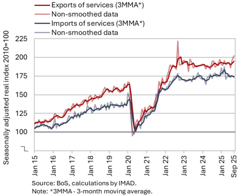 In the third quarter, exports of services were similar to the same period last year (0.1%); growth slowed somewhat in most main groups of services. This year, export growth has been driven primarily by business and ICT services, while tourism-related services increased more modestly and were broadly unchanged year-on-year. Exports of transport and construction services were lower than in the same period last year. Following strong growth at the beginning of the year, service imports declined year-on-year for the second consecutive quarter (–0.5%). In the first nine months, exports and imports of services were on average higher year-on-year in real terms (by 1.8% and 2.3% respectively).