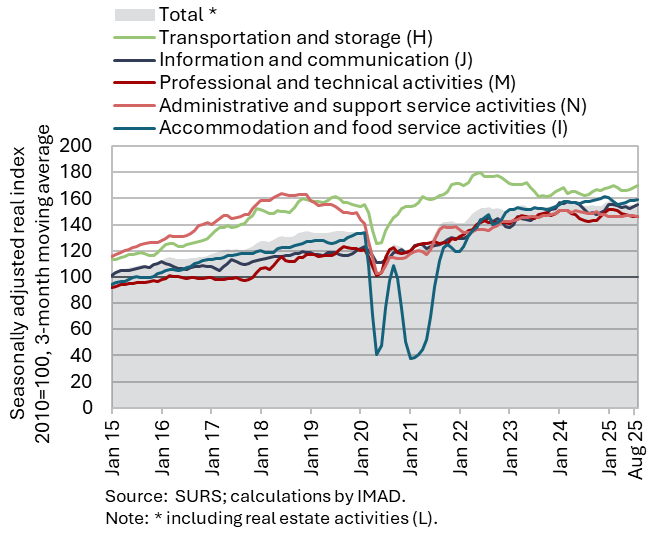 Total real turnover in market services, which had declined in the second quarter and continued to decrease in July, rose sharply in August (by 2.7%, seasonally adjusted), while remaining broadly unchanged year-on-year. Turnover increased significantly in current terms in transportation and storage (particularly in storage) where growth has been sustained over a prolonged period. Growth was also relatively strong in professional and technical activities, following a sharp decline in turnover in the second quarter and in July. In information and communication, modest growth continued in August after an increase in the first half of the year. After an increase in the second quarter and a decline in July, turnover in accommodation and food service activities also rose slightly in August. Turnover decreased only in administrative and support service activities, mainly due to a continued contraction in employment services. In the first eight months of 2025, real turnover was higher year-on-year only in transportation and storage (by 2.3%) and in professional and technical activities (by 0.9%).