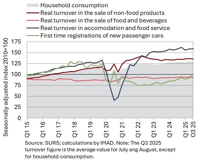 Year-on-year growth in household consumption slowed to 1.0% in the third quarter. In July and August, households purchased significantly more new passenger cars than a year earlier (by 13%), following a year-on-year decline in the first quarter and a 4% increase in the second quarter. Year-on-year turnover growth was also recorded in retail trade with non-food products (up by 1% in real terms), where growth slowed markedly compared with the second quarter, as well as in spending on tourism services abroad (up by 1% in nominal terms). During the summer months, however, households spent less on food and beverages than a year earlier (–2%, after a year-on-year increase in the second quarter), and the number of overnight stays by domestic tourists in Slovenia also decreased (by 2%).