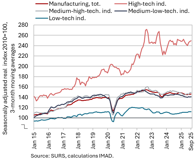 Economic sentiment indicators at the beginning of the fourth quarter suggest a continued strengthening of activity in the euro area. The composite Purchasing Managers’ Index (PMI) reached its highest level in two and a half years in October (52.5), with both components (manufacturing and services PMI) contributing to the improvement. The economic sentiment indicator (ESI) for the euro area also reached its highest level since mid-2023 in October, with confidence strengthening relative to September across all activities and among consumers. Compared to the same period last year, industrial confidence indicator improved markedly. In Germany, Slovenia’s most important economic partner, the composite PMI similarly climbed in October to a two-and-a-half-year high (53.9). In particular, the services PMI strengthened, and the manufacturing PMI, still largely supported by the capital goods sector, also remained above 50 (the threshold between expansion and contraction). The Ifo Business Climate Index for Germany likewise improved, driven mainly by firms’ more optimistic expectations regarding business conditions in the coming months, especially in industry.