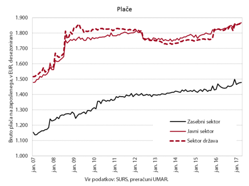 Plačna gibanja ostajajo umirjena. Po stagnaciji v prvem četrtletju je povprečna bruto plača zasebnega sektorja tudi aprila ostala skoraj nespremenjena, v javnem sektorju pa se je nekoliko zvišala.