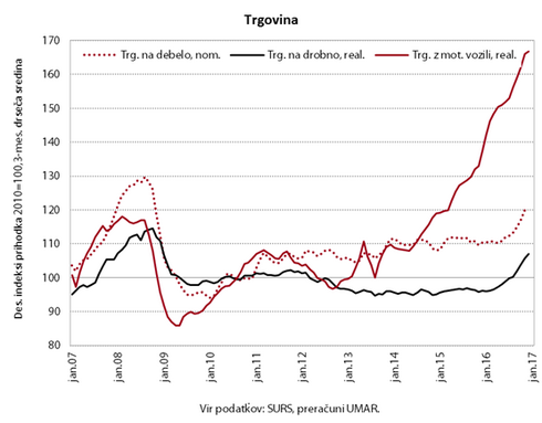 Prodaja v trgovini na drobno se je na začetku leta še okrepila. Prihodek ostaja visok tudi v trgovini z motornimi vozili, na kar vplivata večja prodaja domačim kupcem in večji izvoz vozil.