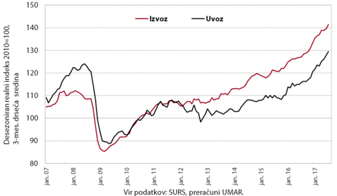 Ob krepitvi tujega povpraševanja se še naprej povečujeta proizvodnja predelovalnih dejavnosti in izvoz. Ob rasti domačega povpraševanja je večji tudi uvoz blaga. Po okrepitvi na začetku leta se je aktivnost v gradbeništvu znižala.