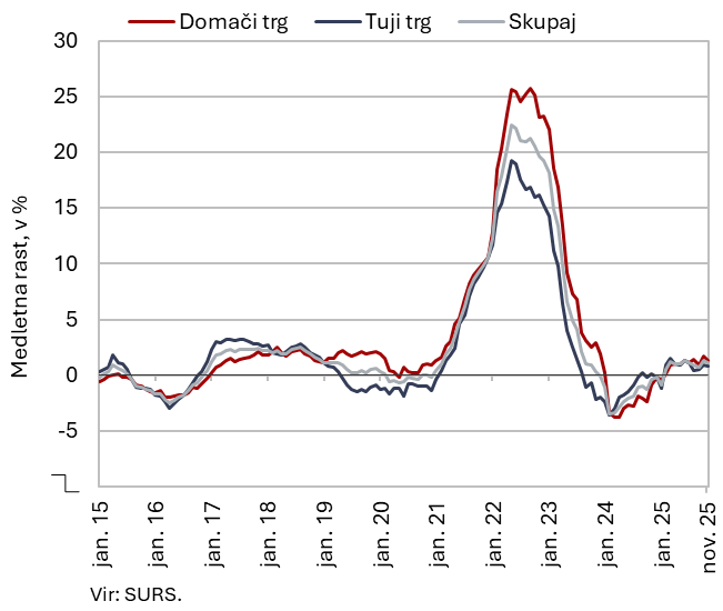Medletna rast cen industrijskih proizvodov slovenskih proizvajalcev se je novembra v primerjavi z oktobrom nekoliko znižala, na 1,1 %. Poraba električne energije v industriji je bila ob enakem številu delovnih dni medletno nižja za 2,4 %, poraba gospodinjstev pa višja za 2,2 %. Medletna nominalna rast povprečne bruto plače je bila oktobra (7,7 %) višja kot v predhodnih mesecih, predvsem zaradi okrepljene rasti v javnem sektorju. Število delovno aktivnih oseb že več mesecev stagnira (desez.), medletno pa je bilo v prvih desetih mesecih in tudi oktobra manjše za 0,4 %. Rast vrednosti opravljenih gradbenih del se je po upadu v prvem četrtletju od drugega četrtletja močno okrepila, v desetih mesecih je bila medletno večja za desetino. Presežek tekočega računa plačilne bilance je v zadnjih dvanajstih mesecih (do oktobra) znašal 2,7 mrd EUR (3,8 % ocenjenega BDP) in je bil za 545,5 mio EUR nižji kot v enakem predhodnem obdobju.