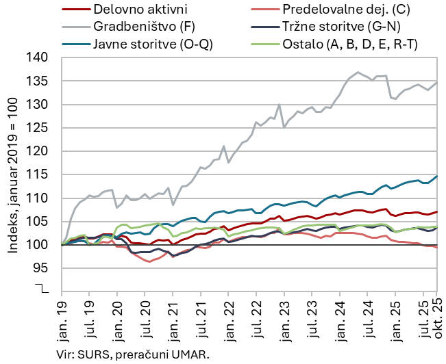 Število delovno aktivnih oseb je oktobra ostalo podobno kot prejšnje mesece (desez.), medletno je bilo manjše za 0,4 %. Število zaposlenih je bilo medletno manjše (–0,6 %), število samozaposlenih pa večje (1,4 %). Največji medletni upad števila delovno aktivnih je bil v drugih raznovrstnih poslovnih dejavnostih (–3,6 %), predvsem zaradi zmanjšanja v zaposlovalnih agencijah, sledijo predelovalne dejavnosti (–2,3 %) ter informacijske in komunikacijske dejavnosti (–1,2 %). Še naprej pa je bilo število delovno aktivnih medletno večje v dejavnostih javnih storitev, kjer izstopa predvsem zdravstvo in socialno varstvo (3,4 %). Število delovno aktivnih tujih državljanov je bilo oktobra medletno večje za 1,5 %, državljanov Slovenije pa je bilo manj za 0,7 %.