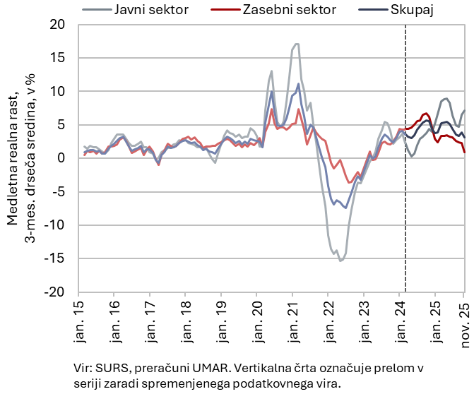 Medletna nominalna rast povprečne bruto plače je bila novembra (2,9 %) nižja kot v predhodnih mesecih zaradi medletno nekoliko nižje plače v zasebnem sektorju (–0,3 %). To lahko povezujemo z medletno precej manjšim obsegom izrednih izplačil (na podlagi poslovne uspešnosti) v pričakovanju uvedbe obveznega zimskega regresa za zaposlene v decembru. V javnem sektorju je ob izplačilu s plačno reformo dogovorjenega zvišanja osnovnih plač rast ostala visoka (8,8 %). V prvih enajstih mesecih leta 2025 je bila skupna povprečna bruto plača realno višja za 4,2 % (nominalno za 6,6 %) – v javnem sektorju za 7,3 %, v zasebnem pa za 2,4 % (nominalno za 9,7 % oz. 4,7 %).