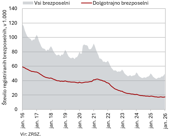 Število brezposelnih je januarja upadlo bolj kot ob koncu lanskega leta (desez.). Število brezposelnih, ki se je nekoliko zmanjšalo tudi že novembra in decembra lani, je januarja upadlo za 0,6 % (desez.) Po originalnih podatkih je bilo konec januarja brezposelnih 49.778 oseb oz. 5,5 % več kot konec decembra, kar pa je večinoma odraz sezonskih gibanj, povezanih z večjim prilivom v brezposelnost zaradi izteka zaposlitev za določen čas. Medletno je bilo število brezposelnih še vedno manjše za 0,7 %. Medletni upad dolgotrajno brezposelnih (–6,1 %) in upad brezposelnih, starejših od 50 let (–4,9 %), sta bila nekoliko nižja kot prejšnje mesece. Število brezposelnih mladih (15–29 let), ki je od oktobra 2024 medletno višje, je januarja raven izpred enega leta preseglo za 6,4 % – bilo jih je 11.108.