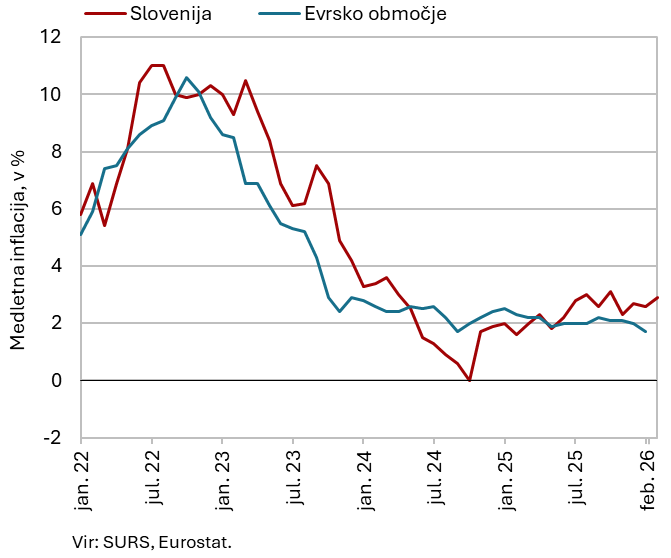 Medletna rast cen življenjskih potrebščin se je februarja okrepila na 2,9 %, predvsem zaradi učinka nizke osnove pri cenah električne energije. Lani februarja so se te ob sprejetju Zakona o nujnih ukrepih za omilitev posledic obračuna visoke omrežnine za gospodinjske odjemalce znižale približno za petino. Zato se je medletna rast cen v skupini stanovanja, voda, električna energija, plin in druga goriva februarja povišala za približno 6 o. t., na 10,7 %, in je prispevala skoraj polovico celotne inflacije. Medletna rast cen hrane in brezalkoholnih pijač (3,6 %) ter storitev (3,2 %) se je umirila. Rast cen neenergetskega industrijskega blaga je ostala zmerna. Cene poltrajnega blaga so bile medletno višje za 0,8 %, cene trajnega blaga pa so ostale nespremenjene.