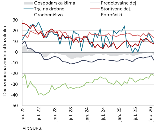 Kazalnik gospodarske klime se je februarja poslabšal po izboljševanju od konca tretjega četrtletja lani. Prvič po avgustu 2025 je zaostal za ravnmi izpred leta in tudi za dolgoletnim povprečjem. Poslabšali so se kazalniki zaupanja v vseh dejavnostih in med potrošniki, ki je edini ostal medletno višji. Po več mesecih skromnega izboljševanja se je poslabšal kazalnik zaupanja v predelovalnih dejavnostih, ki najbolj zaostaja za dolgoletnim povprečjem. Kazalniki zaupanja v ostalih dejavnostih, ki so se februarja nadalje poslabšali, so bili z izjemo trgovine na drobno nižji ali podobni kot pred letom, vendar so ostali nad dolgoletnim povprečjem. Dolgoletno povprečje je drugi mesec zapored nekoliko preseglo tudi zaupanje potrošnikov.
