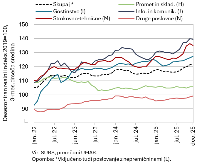 Skupni realni prihodek tržnih storitev se je tudi v zadnjem lanskem četrtletju povečal (desez.), medletno je ostal večji. V gostinstvu se je prihodek začel krepiti kmalu po začetku leta, od druge polovice leta pa tudi v strokovno-tehničnih ter informacijsko-komunikacijskih dejavnostih. V slednjih se je rast proti koncu leta umirila. V dejavnosti prometa in skladiščenja prihodek stagnira že od konca leta 2024. V drugih poslovnih dejavnostih se sicer rahlo povečuje od začetka leta 2025, a zaradi upada v zaposlovalnih agencijah še nekoliko zaostaja za ravnjo iz leta 2019 (vse desez.). Skupni realni prihodek je bil v letu 2025 večji kot v letu 2024 (za 1,8 %), nekoliko manjši pa je bil le v drugih poslovnih dejavnostih (za 0,8 %).