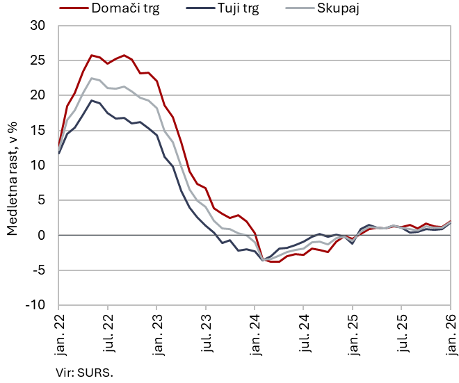 Kazalnik gospodarske klime se je po izboljševanju od septembra lani februarja poslabšal in prvič po avgustu 2025 zaostal za ravnmi izpred leta, pa tudi za dolgoletnim povprečjem. Rast cen življenjskih potrebščin se je februarja povišala na 2,9 % predvsem zaradi lanskega znižanja cen električne energije. Na začetku leta se je okrepila tudi medletna rast cen industrijskih proizvodov pri slovenskih proizvajalcih, ob nizki lanski osnovi in tekoči podražitvi vseh skupin proizvodov z izjemo energentov. Realni prihodek v večini trgovinskih panog in ostalih tržnih storitev se je v zadnjem četrtletju lani povečal in je v letu 2025 večinoma presegel ravni izpred leta. Konec leta 2025 je bilo po anketnih podatkih število delovno aktivnih medletno nekoliko manjše, število brezposelnih pa večje.